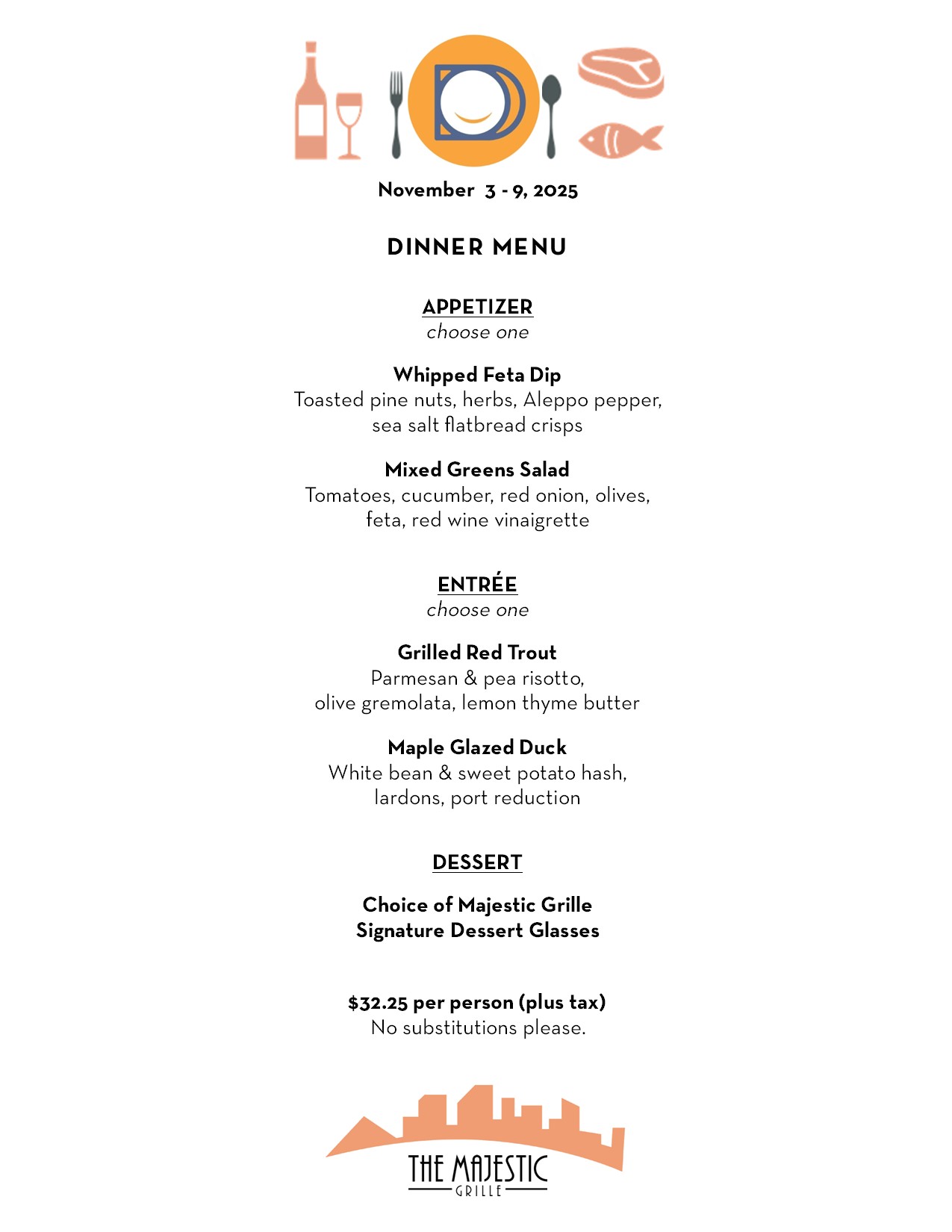 Three course Prix Fixe Dinner Menu Monday-Sunday $32.25 per person